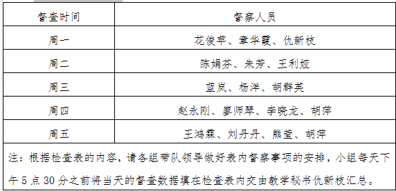 要求三,对无故不开课、擅自停课等延误教学行为一经发现及时报至公司教学副经理核实,同时做好每日听课记录,每组负责人每天在下午5点30分之前将附件2日常情况检查表上报公司教学秘书仇新枝汇总。